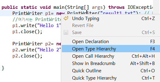 Open Type Hierarchy를 누르면 상위 클래스를 볼 수 있다.